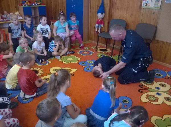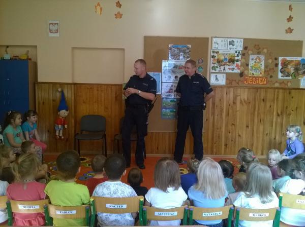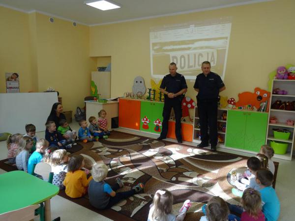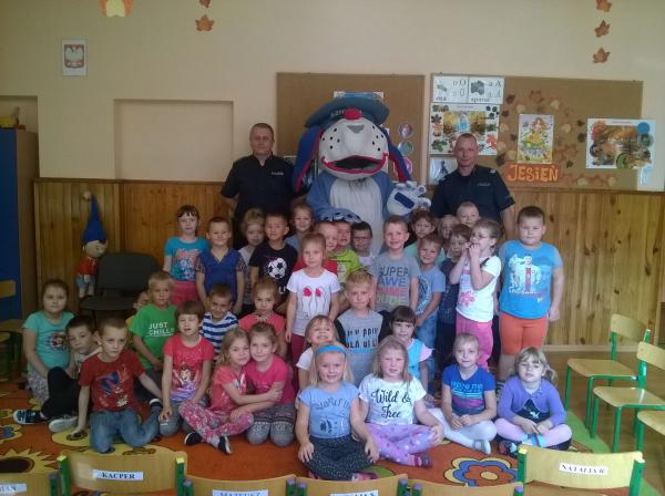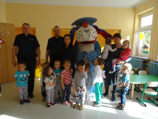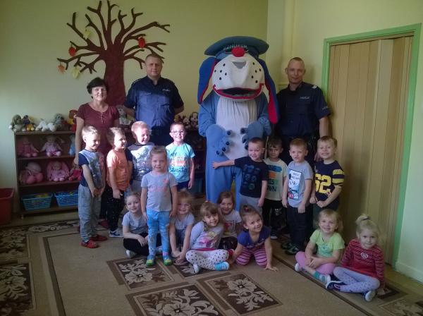 Policjanci uświadomili przedszkolaków o konieczności jeżdżenia w fotelikach z zapiętymi pasami, a także o nie zawieraniu znajomości z obcą osobą.