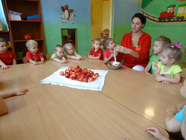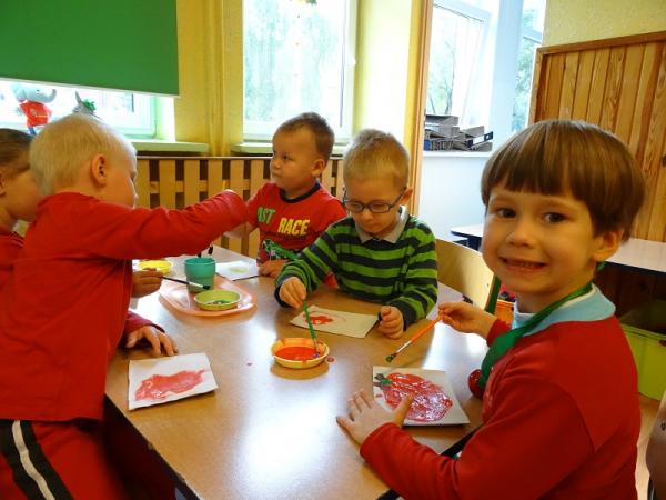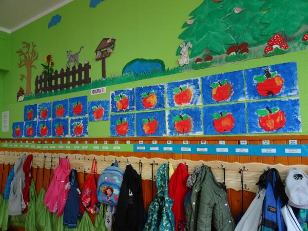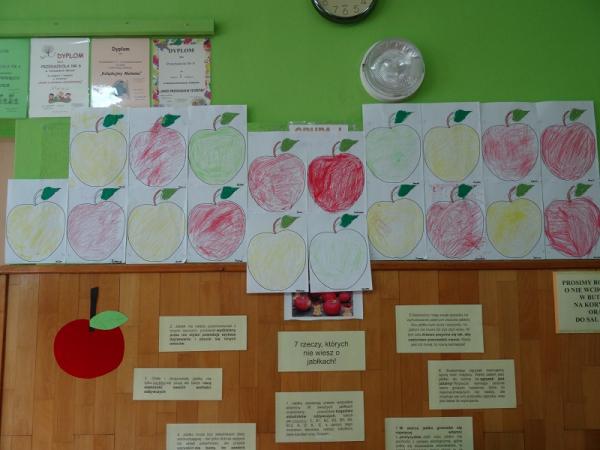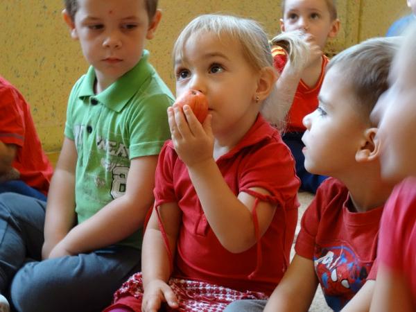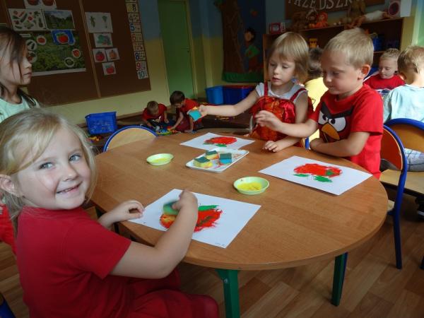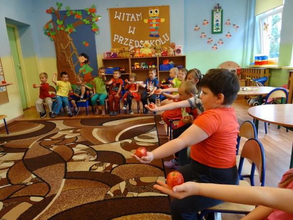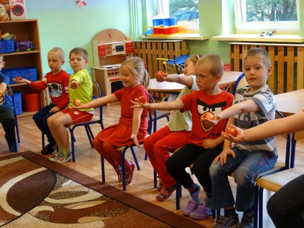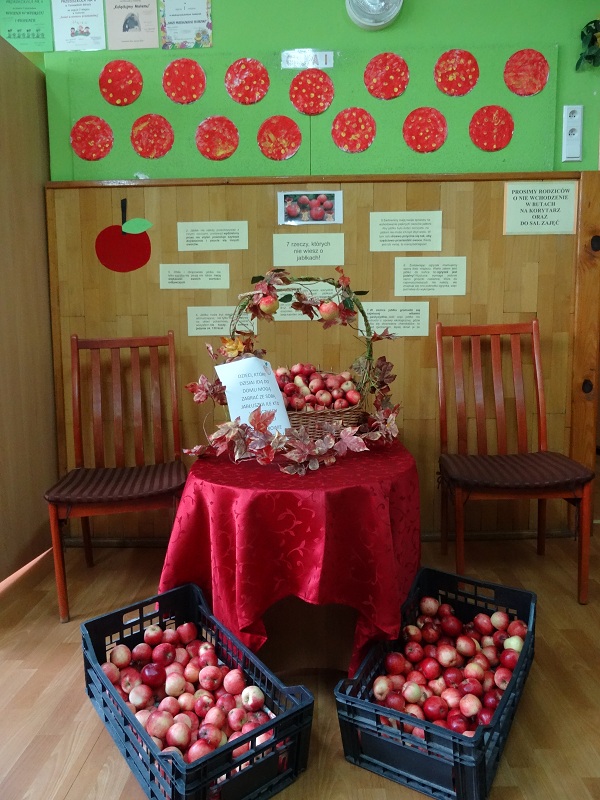 Dnia 23.09.2015r. nasze przedszkole obchodziło Dzień jabłka”. Dzieci poznawały różne gatunki jabłek, rozpoznawały kształt, zapach, kolor i smak. Zdobywały wiadomości na temat potraw i przetworów z jabłek. Dzieci również słuchały piosenek o jabłuszku, zatańczyły „jabłkowy” taniec., przeliczały owoce, porównywały wielkości. A na koniec każdy przedszkolak wykonał prześliczną pracę plastyczną, przedstawiającą jabłuszko.