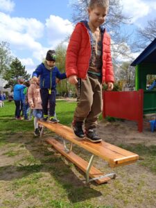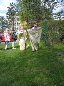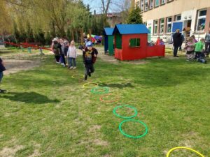 Wszystkie grupy zaczęły ten dzień od rozgrzewki w naszym ogrodzie przedszkolnym. Sportowcy musieli wykonać różnorodne ćwiczenia, które były podzielone na pięć stanowisk. Konkurencjami sportowymi były: skakanie w workach, kopanie piłki do bramki, rzucanie piłeczką do kosza, przechodzenie przez ławeczkę, skakanie obunóż do kółek i przejście przez szarfę.
