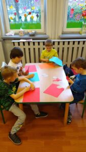 Dlatego dzieci z naszego przedszkola 31 marca świętowały Międzynarodowy Dzień Teatru , który obchodzony jest od sześćdziesięciu lat. Tego dnia sale zamieniły się w wielkie warsztatownie artystyczne. Przedszkolaki tworzyły kukiełki ze swoich ulubionych bajek, tworzyły sceny, na których narysowały swoje ulubione bajki. Zapoznały się z takimi pojęciami jak : aktor, mim, scena, kurtyna, pacynka, marionetka . Wcielały się w różne postaci i odgrywały role.