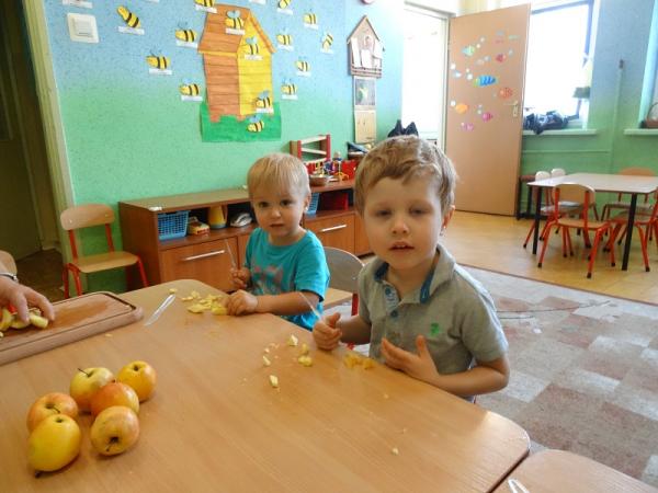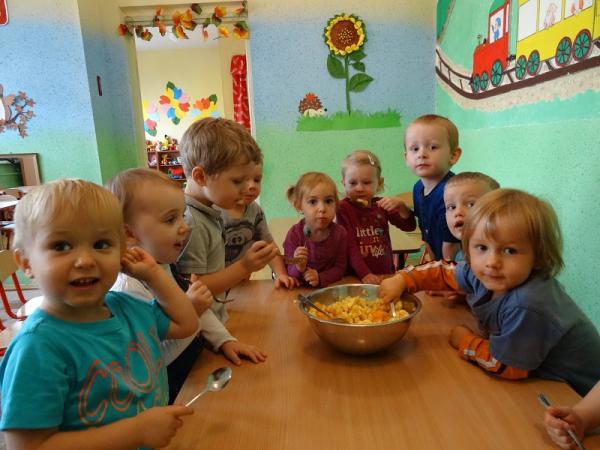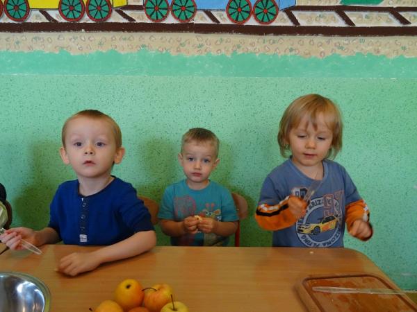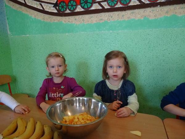 Każdy przedszkolak już wie, jak ważne są dla nas owoce – nie tylko dlatego, że są smaczne, ale przede wszystkim – zawierają mnóstwo witamin, które chronią i wzmacniają nasz organizm. Dlatego nasi najmłodsi przedszkolacy postanowili zrobić pyszną i zdrową sałatkę owocową. Były przygotowania: dzieci umyły owoce, przybory kuchenne, a także rączki Kiedy wszystko już było gotowe, maluszki przystąpiły do krojenia owoców, mieszania i … degustacji. Ach, co to była za uczta! Sałatka smakowała wyśmienicie – niewiadomo, czy dlatego, że owoce były pyszne, czy dlatego że maluszki same ją przyrządziły?