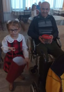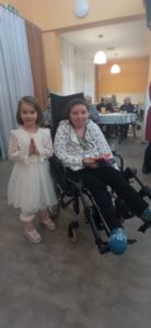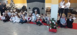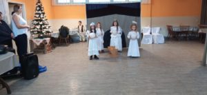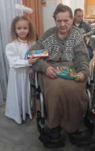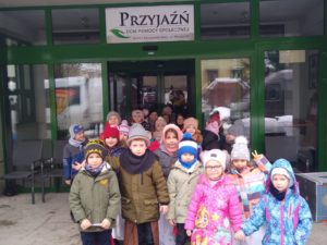 Nasze przedszkolaki 21 grudnia wybrały się z przedstawieniem jasełkowym do Domu pomocy Społecznej „Przyjaźń” w Tarnowskich Górach. Zabrały ze sobą samodzielnie wykonane kartki świąteczne, kosmetyki oraz słodkie upominki dla podopiecznych. Spotkanie sprawiło obu stronom wiele radości. Najbardziej wzruszający okazał się „Taniec aniołów”.