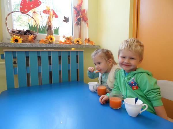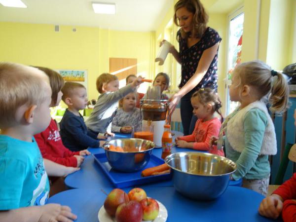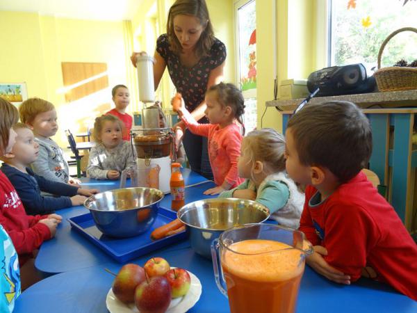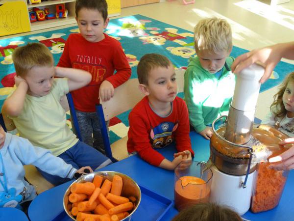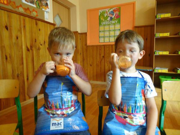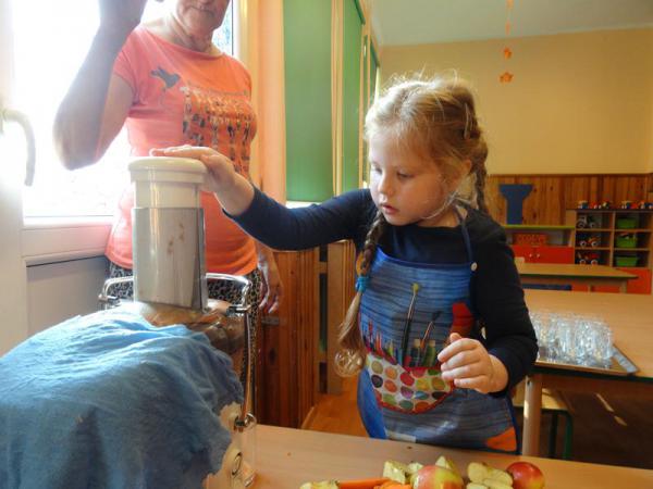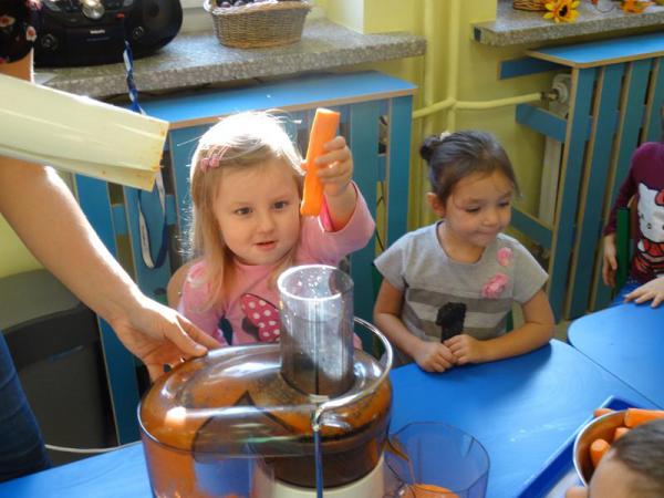 Dnia 12.10.2017r. Dzieci z grupy „Wesołe Misie” oraz „Motylki” postanowiliśmy zrobić sok jabłkowo-marchewkowy. Jednak zanim przystąpiliśmy do pracy, zapoznaliśmy się z urządzeniem do robienia soku – sokowirówką, jego działaniem oraz utrwaliliśmy sobie zasady bezpieczeństwa. Następnie dzieci kolejno pomagały w wyciskaniu soczku z jabłuszek i marchewki. Po skończonej pracy dzieci delektowały się jego smakiem. Wszystkim bardzo smakował, ponieważ wykonany był przez dzieci, bez dodatku cukru i bez konserwantów.