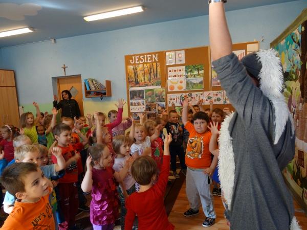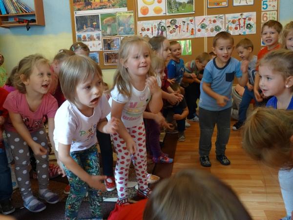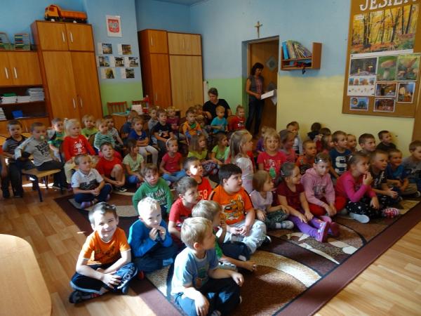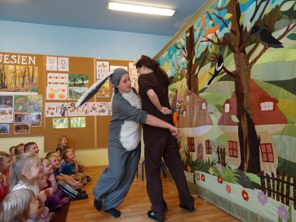 Dnia 30.09. do naszego przedszkola przyjechał Teatr Arkadia z przedstawieniem pt. „Nie wszystko złoto co się świeci”. Aktorzy w sposób radosny i przyjazny zaprezentowali przygody Zajączka i Misia, zwracając uwagę dzieci na takie cechy jak – kultura osobista, dobroć, grzeczność i przyjaźń. Wspólnie śpiewając i rozwiązując zagadki uczyliśmy się jak cenna jest przyjaźń w naszym życiu. Perypetie Misia i Zająca z którymi się zaprzyjaźniliśmy bardzo nas rozbawiły i wiele nauczyły. Dzieci wspólnie z aktorami próbowali nauczyć zajączka grzecznych manier oraz kilku magicznych słów: proszę, dziękuję, przepraszam. Zabiegi by zajączek nauczył się tych słów wywoływały wiele żywych emocji oraz salw śmiechu małej widowni. Piękna scenografia kolorowego lasu, w którym mieszkali nasi przyjaciele, sprawiła że poczuliśmy się jego częścią i przenieśliśmy się w magiczny świat teatru.